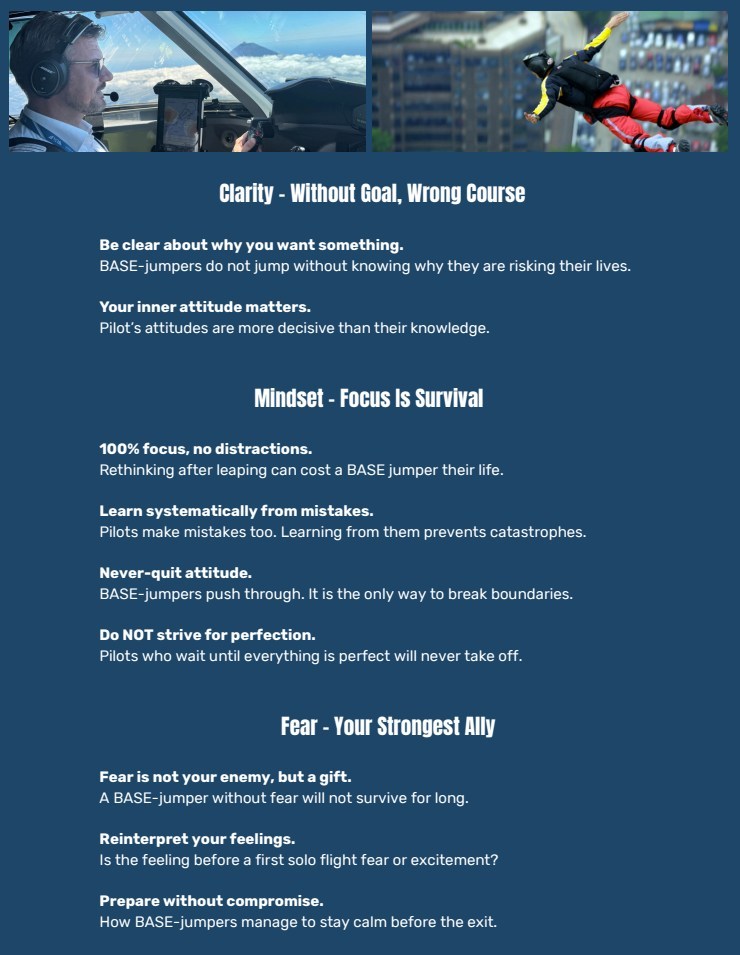 In Mindset of Highflyers, Chris and I combine insights from BASE jumping, aviation, and business leadership to show how top performers think, decide, and execute when conditions are uncertain and stakes are high.